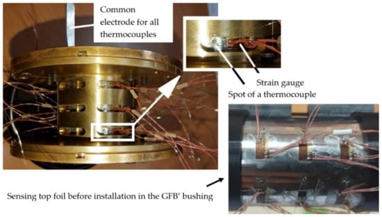 In the following, the novel features of the utilized GFB’s test stand, equipped with the developed sensing top foil composed of a super alloy, Inconel 625, are briefly presented and discussed to highlight application areas available for the proposed measurement approach. As mentioned in the introductory part of the paper, new components, i.e., thermocouples and strain gauges, that were boned to the GFB’s structural part, have advantageously enabled accurate temperature and deformation measurements, and, hence, allow for the assessment of the bearing’s operational conditions in the mechanical and thermal domains, simultaneously.