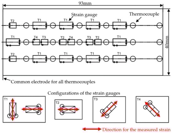Thermocouples and strain gauges centrally axially localized in the top foil used to collect measurement data for the current study.