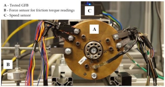 Complete GFB prototype assembly mounted on the electrospindle’s shaft. A simple 125 mm-long lever structure allowed for indirect friction torque measurement via a force sensor. Dedicated 3D-printed clamps, seen at both sides of the bearing, held the sensor cables. The fully assembled and equipped bearing weighed 1165 g. Apart from the gravitational force generated by the bearing itself, no additional load was considered in the test. Hence, the total load for the GFB was estimated to equal 11.43 N, considering the gravitational acceleration 9.81 m/s2. The digits handwritten on the bearing close to the shaft approximate the circumferential locations for the temperature sensors.