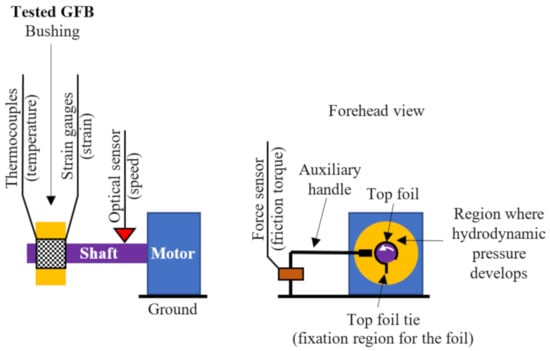 Figure 3 presents the CAD model of the elaborated prototype installation. As visualized, several changes were introduced into the classical construction of a GFB to allow for demanded extraordinary measurement capabilities in the investigated bearing [1,2,3]. First, the geometry of the bump foils was adapted to provide sufficient space for the sensing components installed on the outer surface of the top foil. It is worth mentioning, that even though the area of the bump foils was significantly reduced, the bearing operated correctly providing carrying load capability. Advantageously, there was not experienced any effect that would significantly disturb both the process of developing the air film during the run-up stage and stable operation of the tested bearing. No sagging effect was indicated as well. The number of the circumferentially distributed supporting areas for the bump foils was not changed compared to the initial GFB’s design; however, the authors are aware of the presence of significant changes in the foils’ stiffness and damping properties induced by the bump foils’ incisions. Moreover, the bushing has undergone considerable remodeling, including such additional machining operations as: removal of a significant part to become a spool-shaped component, and milling 18 holes divided into three tierces. All the above-listed operations eventually allowed for the installation of the sensing top foil as well as for radial guidance of all wiring coming out of the thermocouples and strain gauges. Again, the experimental tests performed to complete the run-in process of the top foil confirmed sufficiently high stiffness of the newly-constructed bushing and correct structural behavior of the developed GFB. Specifically, the expected temporal courses of the measured friction torque and temperature were registered during experiments [42], as shown in Section 4. After the running-in process was completed, the values of the measured quantities expectedly dropped. Following the authors’ previous experience, it should be expected that any significant change of the bearing’s elasto-damping properties registered during the running-in process should lead to the considerable variations of the friction torque and temperature.
