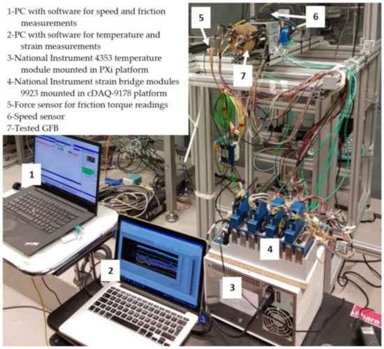 This section provides the details of the measurement system utilized for temperature, strain, friction torque, and rotational speed readings acquisition, and presents an overview on the bearing’s operation scenario arbitrarily selected by the authors to investigate the GFB’s thermal and mechanical behavior for various operational conditions experienced within a single run of the bearing, including the stages: run-up, steady-state run at a nominal rotational speed, and run-out.