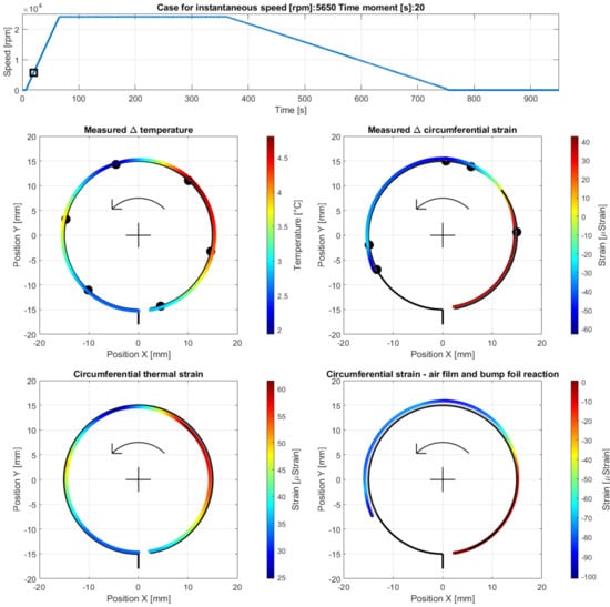 Figure 11. Cross-sectional views for the circumferential distribution of the temperature and strain identified in the top foil at 5650 rpm during the run-up stage of the GFB’s operation. The referential course of the rotational speed is provided on top. Its current value is visualized with a black square marked on the entire speed profile. The arrows indicate the direction of rotation of the shaft. The data presented in the cross-sectional views are explained in the current section.