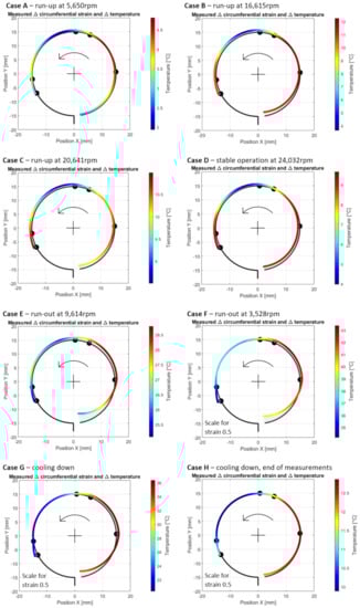 The aggregated data related to the circumferential distribution of the measured temperature and strain for all the above-introduced cases are shown in Figure 19.