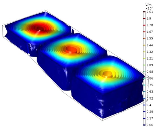 As shown in Figure 3, when the microwave power is 100 W, the strongest electric field exists at 1/4 of the resonance wavelength. According to the electric field distribution in the cavity, the position of the opening for placing the quartz tube is set at 1/4 resonance wavelength away from the short-circuit end face. Two openings are, respectively, designed at the upper and lower ends at 1/4 of the resonance wavelength from the resonant cavity, for inserting the quartz tube and the subsequent input of gas and ADN-based liquid propellant. Because the larger the aperture diameter, the more obvious the weakening of the electric field; if the size is too small, the processing difficulty increases sharply. Therefore, under the premise of satisfying the input of air intake and propellant flow, the aperture should be reduced as much as possible to improve the utilization rate of microwaves. The final selected aperture is 28 mm. The inner diameter of the matching quartz tube is 25 mm, the outer diameter is 28 mm, and the height of the quartz tube is 15 cm.