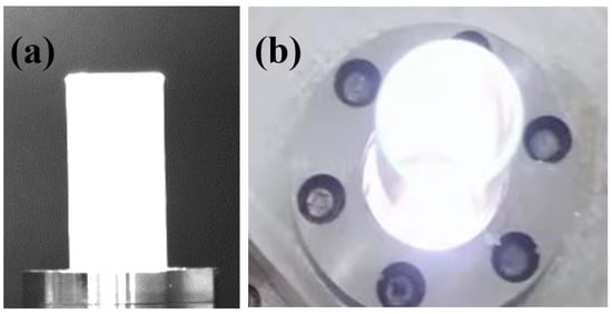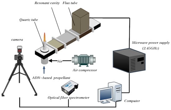 Figure 4 is a schematic diagram of a microwave plasma ignition experiment system, which is composed of a microwave generation component, a microwave plasma ignition component, and an experimental data acquisition system. The function of the microwave-generating component is to generate microwaves and transport them into the resonant cavity. The microwave generation component includes a microwave power supply, a magnetron, a circulator, a detector, a cooling water tank (including a water pump), and a waveguide connected to a microwave ignition component. The microwave power supply and the magnetron together constitute the microwave source. Circulators and detectors are used to control the direction of microwave transmission and monitor the reflected microwave power. The function of the water pump is to provide cooling water for the whole device, and the water in the load tank is used to absorb the reflected power. The function of the microwave plasma ignition component is to realize the coupling of microwaves in the cavity and decompose the gas to achieve ignition and combustion. The microwave ignition component is centered on a resonant cavity and includes a supporting connection device, a 550-9 air compressor (Fengbao, Shanghai, China), and a BT300-2J peristaltic pump (Longer, Shanghai, China). The main body of the microwave ignition component is a gradient reduction altitude resonant cavity based on the BJ26 waveguide. It is opened at a distance of 1/4 resonance wavelength from the short-circuit end and a quartz tube is placed through it. At the lower end of the resonant cavity, an aluminum connection device is assembled with the cavity to connect the peristaltic pump to the air compressor. Two connectors capable of connecting the trachea are set on the side of the connection device. The gas working medium is passed from both ends at the same time during the test to ensure the uniformity of the gas input and avoid the interference of the uneven gas distribution on the test on one side. The bottom end of the connection device is used as the propellant input end, and the propellant supplied by the peristaltic pump is nebulized and pumped into the combustion reaction area in the cavity by inserting the nozzle. The inner conductor is set in the fixed position of the tube and is used to couple the microwave energy to generate a strong electric field, penetrate the gas working medium, and stimulate the generation of microwave plasma. The gas working medium is sent into the resonant chamber through the self-connected device of the air compressor. The microwave energy is directly coupled into the designed resonance cavity through the BJ26 aluminum waveguide with ionized gas working medium in the quartz tube to generate an air plasma. The ADN-based liquid propellant is pumped into the resonant chamber through the opening of the lower end of the connection device of the peristaltic pump through a joint with a diameter of 0.2 mm and reacted with the microwave. The function of the experimental data acquisition system is to collect and record the jet height, flame temperature, and combustion spectrum of the flame in the experiment. It is mainly composed of a temperature sensor, a fiber optic spectrometer, and a high-speed camera. The temperature sensor uses a K-type armored thermocouple with a diameter of 2 mm and a length of 15 cm. Its maximum temperature resistance is 1573 K, and it can carry out long-term high-temperature measurements. The measurement error is 2%. It is fixed above the quartz tube by a clamping device 10 mm. The maximum spectrum measurement range of Ocean USB 2000+ fiber optic spectrometer (Ocean Insight, Orlando, FL, USA) is 200–900 nm, the resolution is 1.5 nm, and the detection integration time is 1 ms. In order to ensure that the measurement signals all come from the measurement target object, a collimating lens is added to the fiber optic probe. The high-speed camera model is Pho-Tron Nova S9 (Photron, San Diego, CA, USA). The maximum shooting speed of the camera is 193 frames per second (corresponding resolution: 256 × 128). In this experiment, under 1024 × 1024 (1 million) pixels, the acquisition frequency of the camera is set to 500 frames per second, which can better understand the instantaneous changes in the flame combustion process. In the experiment, a high-speed camera is used to photograph the changes in the flame during the combustion process, and to record the formation, development, and evolution of the flame in a stable combustion state.