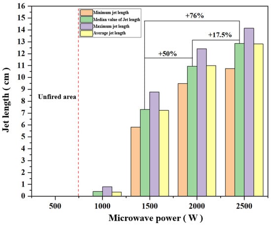 Figure 6 shows the median, mean and maximum values of the air plasma jet length at different microwave powers. The measurement of jet length is based on the contact surface between the quartz tube and the boss. The median values of plasma jets with different microwave powers in the experiment are 0 cm, 0.4 cm, 7.3 cm, 10.95 cm, and 12.87 cm, respectively. The difference between the average value and the median value of each power jet length above 1000 W is within 1%. When the microwave power was increased from 1500 W to 2000 W, the median value of the jet length increased by 50%, and when the microwave power was increased from 1500 W to 2500 W, the jet length increased by 76%, which means that the increase of the microwave power on the air plasma jet length is nonlinear, and the rate of this growth is gradually slowing down. The maximum value of the air plasma jet length at 1500 W power does not exceed the minimum value of the plasma jet length at 2000 W power, while the average value at 2000 W is already greater than the minimum at 2500 W. This phenomenon also explains the increase from the side. The increasing trend of microwave power to the plasma jet length is gradually weakening. In general, when the gas flow rate is fixed, the microwave power can increase the length of the plasma jet, but this gain is gradually weakened with the increase of the power. It can be guessed that when the power increases to a certain level, the gas will be ionized to the greatest extent to generate plasma so that the subsequent power increase cannot further increase the total amount of plasma, and the length and area of the jet will not increase.