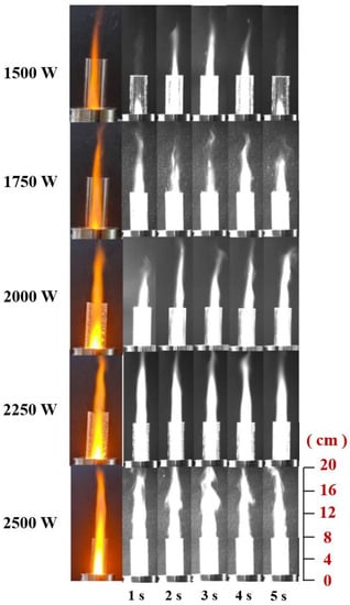 In the combustion jet experiment of ADN-based liquid propellant with microwave power, according to the experience obtained from the previous microwave power ionization experiment of the gaseous working medium, and the guidance of the minimum power of propellant ignition, keep the propellant flow rate at 20 mL/min, the gas flow rate was 20 L/min, and the microwave initial condition was increased from 500 W to 1500 W, and the combustion of ADN-based liquid propellant was tested under the action of five microwave energies: 1500 W, 1750 W, 2000 W, 2250 W, and 2500 W. Figure 7 shows the combustion images of ADN-based liquid propellants at different times under different microwave powers.