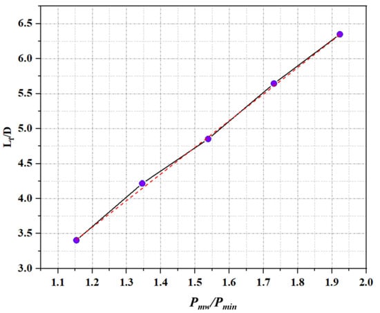 The input microwave power was compared to the lowest microwave power to achieve the ignition of ADN-based liquid propellant, and the median value of the jet length was compared with the inner diameter of the quartz tube to achieve dimensionless parameters. Figure 8 is the dimensionless processing of the flame jet length under the action of microwave power. Through the parameter fitting after dimensionless, it can be found that all data are distributed on both sides of a straight line, which is linearly distributed, and the straight line can be expressed as: