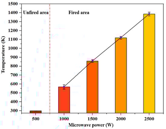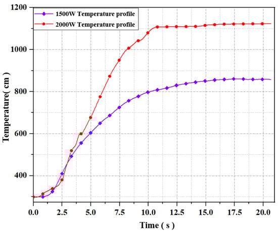 Figure 9 shows the plasma temperature corresponding to different microwave power during stable combustion, where the error bar represents the upper and lower fluctuation range of the flame temperature during the stable combustion period. Since there is no microwave plasma generation in the case of 500 W, it can be regarded as the room temperature during the experiment, which is 298.33 K. In the case of 1000 W, the plasma jet is short, and the collected data is the temperature of the hot air flowing upward in the tube after the plasma jet is generated or the invisible outer edge of the flame, so the temperature fluctuation range is relatively large and relatively inaccurate. When the microwave power is above 1500 W, the thermocouple can directly measure the plasma jet itself. Taking the temperature of 1500 W as the benchmark, the temperature rise ratio corresponding to the three cases of 1500 W, 2000 W, and 2500 W is approximately 45%. Overall, with the increase in microwave power, the temperature of the plasma jet showed an upward trend. When the microwave power was 2500 W, the temperature of the plasma jet reached 1400.15 K. Figure 10 is the heating curve under the microwave power of 1500 W and 2000 W. It can be seen from the figure that the increase in microwave power not only increases the temperature at a stable rate but also affects the temperature rise rate. The temperature rise rate is faster under the microwave power of 2000 W than that under 1500 W. Under the continuous action of a 2000 W microwave, the time required for the combustion temperature of the propellant to rise to 800 K is 5.75 s, while the time required for 1500 W is about 10 s, which means that the increase in power also has a certain enhancement effect on the temperature rise rate.