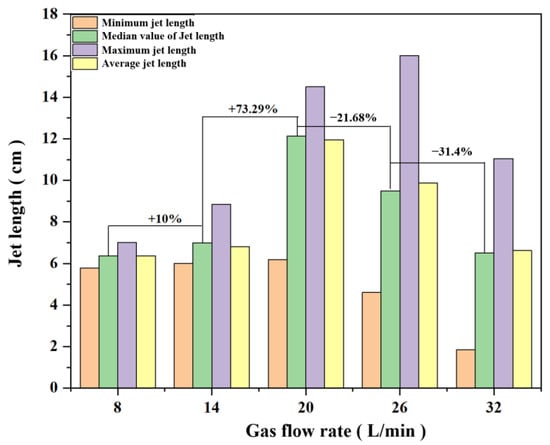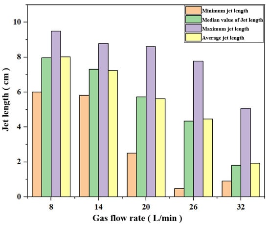 Figure 16 shows the statistical parameters of the propellant combustion jet at different gas flow rates. As can be seen from Figure 15, when the gas work-quality flow rate is below 26 L/min, it has little effect on the minimum value of the combustion jet, and the minimum values of the first three groups of experiments are all around 6 cm. When the gas flow rate is 8 L/min, the gas flow rate is low, and the maximum value of the combustion jet flame produced is not much different, and the flame jet length is relatively stable, but the jet length is short, and the maximum value of the jet length is 7.02 cm; when the gas flow rate increases to 20 L/min, the combustion jet shows an obvious growth, and its maximum value is 14.51 cm, which is nearly double compared with 14 L/min. At the same time, the median value of the jet also showed a significant increase of 73% compared to 14 L/min, indicating that the flame combustion was better at 20 L/min. The further increase in the gas flow rate led to a decrease in the average length of the jet. At the gas flow rate of 26 L/min, the maximum value of the flame jet increased, but the median value of the jet length decreased more significantly with the average and minimum values, in which the median value decreased by 21.68% compared with 20 L/min. The maximum value of the jet length at 32 L/min also decreases significantly, by 5 cm compared to 26 L/min; the median value decreases by 31.9% compared to the median value at 26 L/min, totaling 3.06 cm. proceeds, resulting in a shortening of the flame length.