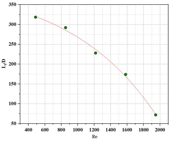 Figure 14 shows the dimensionless processing of the plasma jet length under different gas working medium flow rates. The abscissa is the Reynolds number, and the ordinate is the median value of the air plasma jet length ratio to the inner diameter of the quartz tube to achieve dimensionless parameters. Through the parameter fitting after dimensionless, it can be found that the data is distributed in exponential form, and the fitting line can be expressed as .