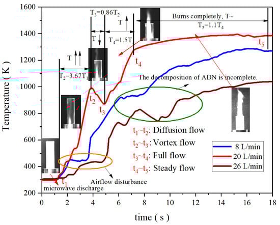 Figure 17 shows the temperature rise curves of ADN-based liquid propellants at 8 L/min, 20 L/min, and 26 L/min of gas flow rates. Taking temperature as an indicator, the temperature change process is divided into four modes according to the way the gas flows, including diffusion flow, vortex flow, full flow, and steady flow. When microwave discharge begins, air diffuses and flows in the resonator and the temperature rises rapidly to peak T2. When the spray and the airflow are mixed, a vortex occurs, ADN cannot be completely decomposed, and the temperature is briefly reduced to T3. With the increase of airflow rate, the oxygen content in the resonator increases, the oxidation reaction of methanol occurs, and the flame temperature rises sharply. Finally, the propellant burns more completely as the gas flow stabilizes. In the case of 8 L /min, the temperature rise curve shows a stepped rise, with a flat period of nearly 1 s after the temperature climbs, after which the temperature continues to rise until it reaches the maximum temperature. The temperature rise curve for 20 L/min also has a stepped rise, but the duration is very short and distributed within 2.5 s at the beginning of the rise. Unlike the 8 L/min case, the temperature rise curve for the 20 L/min case has a period of decline, a brief drop in temperature followed by a rapid rebound and peak temperature. In contrast, the step-like distribution of the temperature rise curve is more obvious and longer in duration for the case of 26 L/min of gas flow rate. The curve also has a short drop in temperature after reaching the extreme value, but the duration is significantly longer than that of 20 L/min. The temperature extremes in the heating curve and a brief drop may be due to the decomposition of the ADN itself, before reaching the first extremes of the ADN itself in the microwave action exothermic, and in the case of 8 L/min there is no significant temperature drop, but a period of flat, which may be due to the lower gas flow rate. In the case of the same input power, the ADN-based liquid propellant absorbed more power so that the combustion temperature does not appear to drop significantly after reaching the extremes due to decomposition. The comparison of the temperature profiles shows that the temperature rises faster at 20 L/min and the duration of the temperature steps during the warming process is shorter.