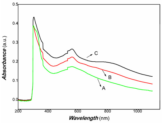 The UV-Vis-NIR of Pt/PVDF nanocomposite (A, B, C: the content of HPtCl4 adding is wt. 3.22, 6.25, 9.09%, respectively).