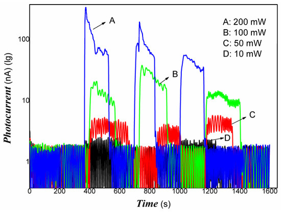 The representative photo-responses of Pt/PVDF nanocomposite to different powders of 808 nm NIR (10, 50,100, and 200 mW).
