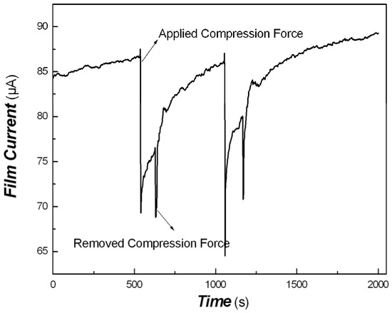 Based on the sea/island model of a nanomaterial-filled polymer system, the nanomaterials acted as islands, and the polymer matrix looked like a sea. Polymers have viscoelastic properties similar to that of unideal springs. Pt nanodots were interconnected with polymers. When an external force was applied to the nanocomposite, the conductivity of the nanocomposite would change naturally due to the stretching and contraction of the polymer. In this study, Pt/PVDF nanocomposite belongs to the organic/inorganic hybrid. PVDF, as its non-conjugated polymer component, has good flexibility. When an external force was applied to organic/inorganic nanocomposite, the deformation of the polymer occurred. The distance between Pt particles would be longer, and the conductivity of the nanocomposite was decreased. If an external force were removed from organic/inorganic hybrid composite, its deformation would also recover. The distance between Pt particles would be shorter, and the conductivity of the nanocomposite would be increased. Therefore, the tentacle sensitivity examination of nanocomposite to compression force of about 50 g was carried out. Preliminary response results are shown in Figure 10.