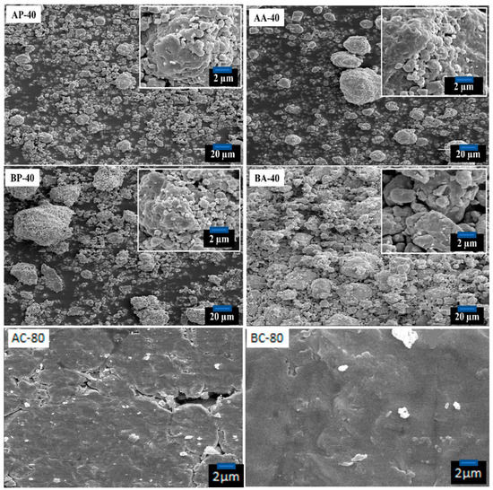 SEM images corresponding to samples AP-40, AA-40, BP-40, BA-40, AC-80, and BC-80.