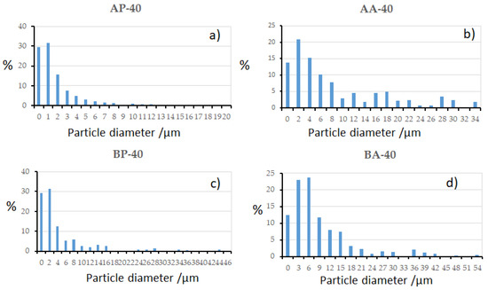 Particle size distribution of: (a) AP-40, (b) AA-40, (c) BP-40, and (d) BA-40.