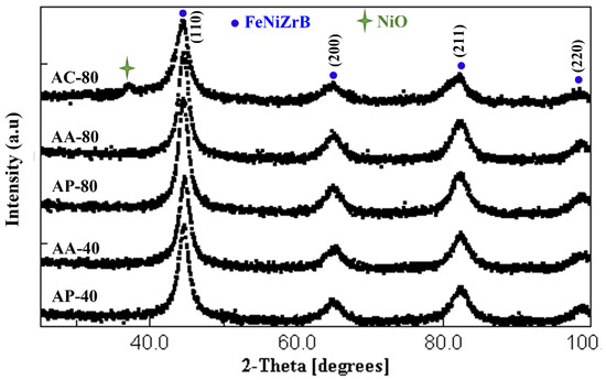 The morphologies (SEM micrographs) for samples AP-40, AA-40, AC-80, BP-40, BA-40, and BC-80, are presented in Figure 1. A noticeable difference in the uniformity of the particle size (micrometric range) for powders and agglomerated particles of both alloys can be observed. The comparison was possible in sample A (Fe80(NiZr)8B12) because the agglomerate particles deagglomerated easily, allowing the particle size distribution to be evaluated. The formation of agglomerates is caused by particle deformation and welding during milling.