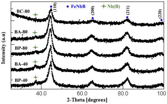 XRD diffractograms for samples of B alloy (Fe80Nb8B12).