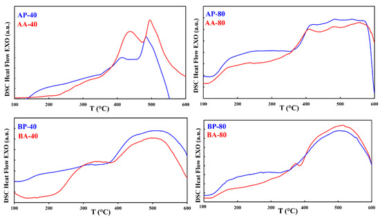 DSC curves collected in pairs for samples (AP-40 and AA-40), (AP-80 and AA-80), (BP-40 and BA-40), and (BP-80 and BA-80) to observe the behavior of powders and agglomerated particles after the same milling duration.