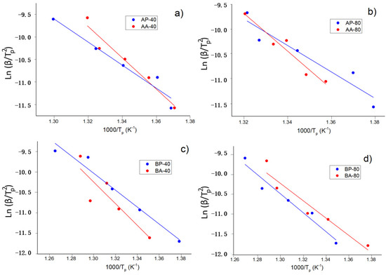 Kissinger linear fitting to determine the activation energy of the crystallization process of the powders and agglomerates (each experimental point corresponds to peak temperatures measured at 5, 10, 20, and 40 K/min). (a) Sample A-40h, (b) sample A-80h, (c) sample B-40h, and (d) sample B-80h. Activation energy (and its uncertainity) are given in Table 4.