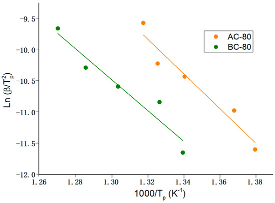 Figure 7 and Figure 8 depict the linear fitting, while Table 4 provides the apparent activation energy. Using the following relation, the apparent activation energy is calculated from the slope of the linear fit where R is the universal gas constant: