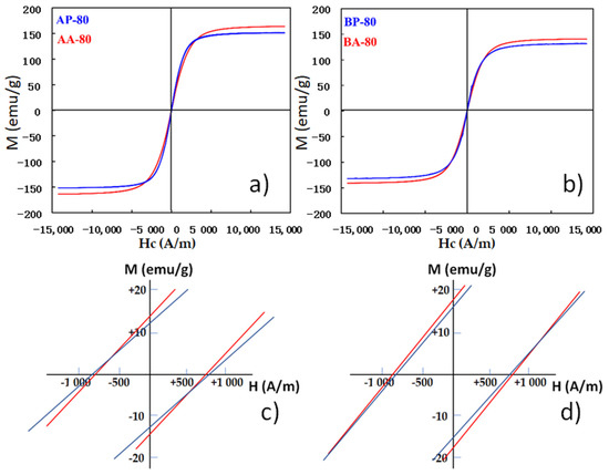 Magnetic hysteresis loops of samples: (a) AP-80, AA-80, (b) BP-80 and BA-80 and insets of the (0,0 region), (c). AP-80, AA-80, (d) BP-80 and BA-80.