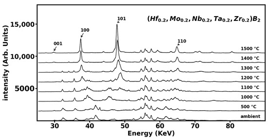 Energy-dispersive X-ray diffraction pattern of ball-milled powder mix of HfO2, MoO3, Nb2O5, Ta2O5, ZrO2, carbon black, and boron carbide at various temperatures. The transformation begins at 1100 °C and by 1500 °C the (001), (100), (101) and (110) peaks of the hexagonal AlB2-type phase of (Hf0.2Mo0.2Nb0.2Ta0.2Zr0.2)B2 are apparent.