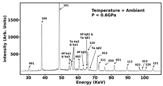 The synthesized sample of (Hf0.2Mo0.2Nb0.2Ta0.2Zr0.2)B2 at ambient temperature and at a pressure of 0.6 GPa after annealing at 2000 °C for one hour. The fourteen diffraction peaks from the hexagonal AlB2-type phase of (Hf0.2Mo0.2Nb0.2Ta0.2Zr0.2)B2 are indexed, indicating completion of the transformation process along with the X-ray fluorescence emission from Hf and Ta.