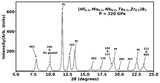 The angle dispersive X-ray diffraction pattern of (Hf0.2Mo0.2Nb0.2Ta0.2Zr0.2)B2 sample mixed with platinum (Pt) pressure marker at the highest pressure of 220 GPa. The hexagonal AlB2-type phase was found to be stable to 220 GPa as evidenced by the assignment of (hkl) Miller indices to all the observed peaks along with the face centered cubic platinum pressure standard.
