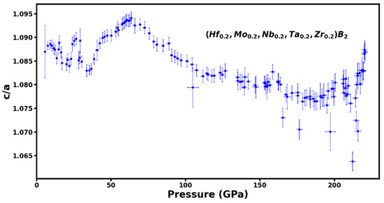 The axial (c/a) ratio for the hexagonal AlB2-type phase of (Hf0.2Mo0.2Nb0.2Ta0.2Zr0.2)B2 as a function of pressure to 220 GPa. The axial (c/a) ratio shows only slight variation of 2–3% over a large pressure range indicating lack of strong anisotropic compression effects.