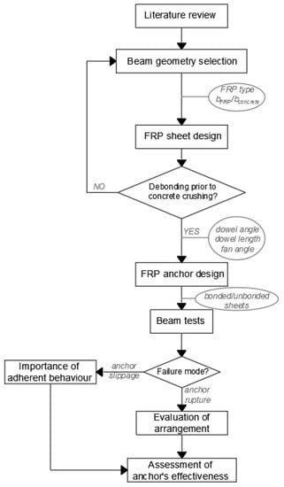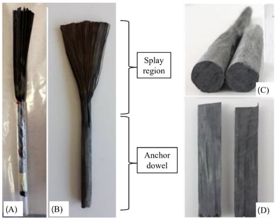 Fibre-reinforced polymers (FRPs) are broadly employed as a retrofitting method for existing reinforced concrete structures, due to the considerable advantages of these materials, such as their high strength-to-weight ratio [,]. However, one limitation of this technology is its premature debonding failure from the substrate. This failure mode has been widely studied [,,] and is the basis for design models in different international guidelines [,,]. Additionally, international researchers have aimed to develop anchorage techniques which are able to prevent of delay debonding [,,]. Such techniques mainly include C-Anchors [], patch anchors [], and spike anchors. Among these techniques, FRP spike anchors (in this paper, “spike anchors”, “FRP anchors”, “anchors” and “connectors” will be used indistinctively) have been highlighted as they are versatile, non-corrosive, and have more ease to control during application [,]. Previous studies on FRP anchors employed handmade solutions consisting of a rolled sheet, in which one half was embedded in the substrate by inserting it into a predrilled hole, and the other half conformed and a splay region, of anchor fan, which was bonded onto the FRP reinforcement. In subsequent research works, anchors were developed from carbon fibre ropes, keeping the two distinct regions. Aiming at further industrialization, the dowel part can be precured with an epoxy resin matrix, so it can be easily introduced in the predrilled hole in the substrate.