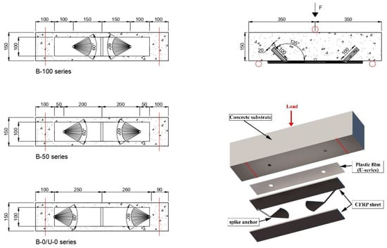 Five different series were evaluated, as collected in Table 1 and Figure 3: a control series (without anchors), three series varying the position of the anchor with respect to the unloaded end of the reinforcement and one series with unbonded, anchored joints, in which anchors were pierced leaving no sheet length behind the anchor (similarly to the B-0 series). The adherence of FRP sheet to the concrete was prevented in the U-series by applying a plastic film between the substrate and the reinforcement, of a material to which the epoxy resin has no adhesion. This led to the load-transfer mechanism being carried entirely by the anchor from the initial load steps.