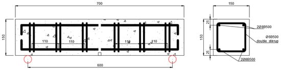 The Internal reinforcement consisted of B500S steel longitudinal rebars and double vertical stirrups; the longitudinal rebars were not connected in the midspan, nor was the anchorage length provided, to isolate the joint behaviour at each half of the beams. Quality of stirrups was controlled by means of UNE-EN ISO-1. The diameter for bending end hooks of reinforcement was four times the diameter of bent rebar/stirrup. The aim of the internal reinforcement arrangement was to prevent shear failure, while the concrete remains virtually unreinforced against bending moment so as to isolate the performance of the reinforcement. The arrangement of the internal reinforcement can be seen in Figure 4.
