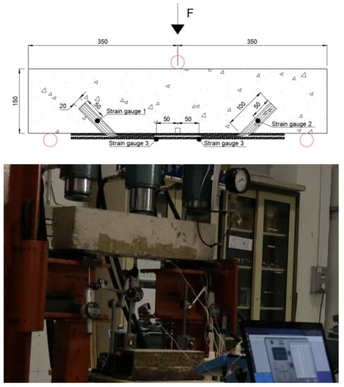 The load was applied through a hydraulic jacket, attached to a manometer that allows consulting intermediated loads. Intermediate values for load–displacement control were obtained every 1.25 kN, for assessment of proper measurement of the strain gauges as internal monitorization. The load was introduced in sustained steps of 5 kN, with continuous monitorization of the midspan deflection, and of the strains in the reinforcement and anchors. Load speed allowed intermediate measurement of deflections and load every 1.25 kN. The steps of 5 kN were employed to stop introducing load until the strain gauges were stabilized per each load step. The test set up is collected in Figure 5.