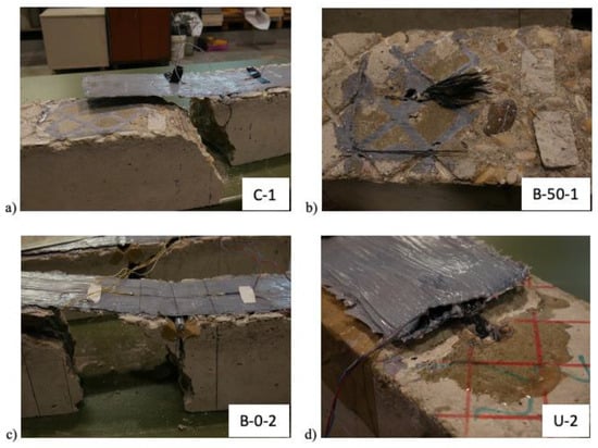 In most bonded specimens with anchors, the failure mode was debonding followed by anchor rupture, which occurred in the bending zone or in the beginning of the anchor fan. In Figure 6b, it is possible to observed that the fibres are properly impregnated, exhibiting a rupture independent from the adherence to the FRP sheet. The failure provoked by concrete splitting is caused by the apparition of an almost horizontal cracking line that diverges from the main vertical bending cracking, thus provoking concrete separation and hinders the full exploitation of the anchor, as the beam splits in two parts by the propagation of the cracking up to the bonded surface.