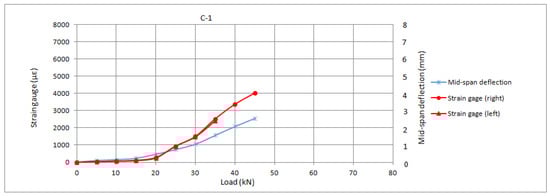 It can be observed from the graphs presented in Figure 7 that the strain in the reinforcement is linear and almost negligible prior to the initiation of concrete cracking, which occurred at acting loads of around 20–25 kN. Once cracking of concrete is initiated, the reinforcements achieved an almost linear behaviour, but with higher stresses, up to the complete debonding when there is a sudden drop in the strains.