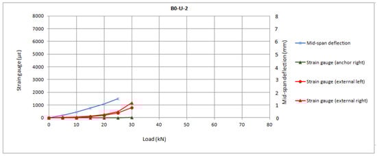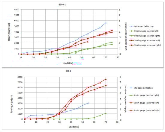 It can be observed from Figure 8, that there is a difference in terms of the load at which load-transfer to the anchors is initiated, as a result of the different position of the anchor. It should be noted that the anchor’s location closer to the loaded end (B-100 series) allows for fuller exploitation of the anchor as its contribution is fruitfully added to the remaining bond behaviour. In the B-series, the connector begins to carry load prior to complete debonding, so debonding stops propagating towards the end of the FRP sheet and thus provides a synergistic effect with the anchor. This can be contrasted with the greater slope in the B-0 series, in which, at the load corresponding to complete debonding of the control series (around 45 kN), there is a detachment of the FRP sheet in front of the anchor, and from 60 to 70 kN the load is almost completely carried by the anchors.