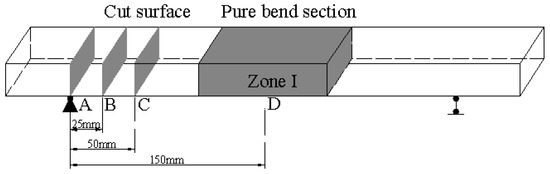 After every four FTCs, relative dynamic elasticity modulus (RDEM) was measured using ultrasonic waves technique [35]. The longitudinal RDEM was first measured at the two ends of the specimen. The middle part of the two loading points was the pure bending section in which the maximum bending moment was generated. The transversal RDEM was measured at positions A, B, C and D, as shown in Figure 2, which is corresponding to the planes under 0, 0.25, 0.5 and 1 of the maximum bending moment in the pure bending section, respectively. A is the support position, at which the bending moment is 0.