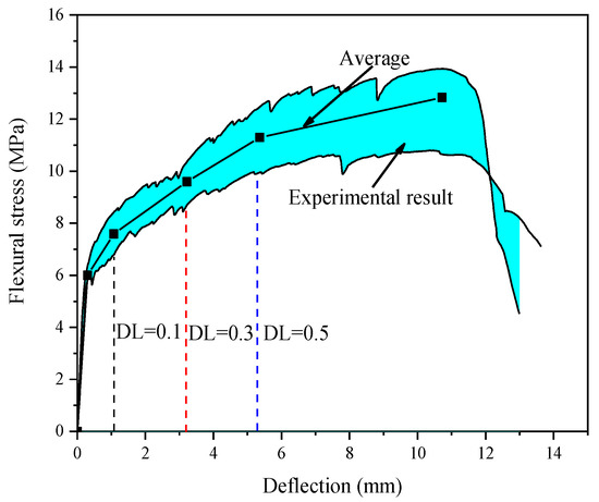 Load-midspan deflection curve of the 28-day-cured specimen was plotted in Figure 3. The shadow area represents the experimental limits. The different deflection levels are marked with colored dotted lines, and the average of the stresses are indicated by black lines. As anticipated, ECC has demonstrated the deflection hardening behavior [35]. The average ultimate flexural strength is 13.83 MPa, corresponding to a deformation of 10.72 mm. The applied four deflection levels (DLs), namely 0, 0.1, 0.3 and 0.5, were determined as 0 mm, 1.07 mm, 3.22 mm and 5.36 mm, respectively. They correspond to the stress level of 0.59, 0.75 and 0.88, respectively.