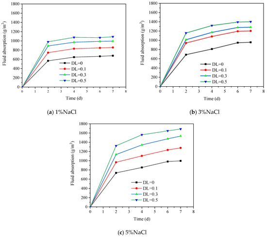 - Both the sustained load and salt concentration (no more than 5%) result in higher fluid absorption. The water absorption distributes in the range of 600–1800 g/m2. The increment rate decreases with the salt concentration.