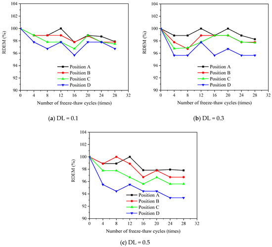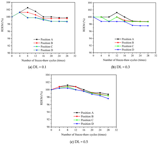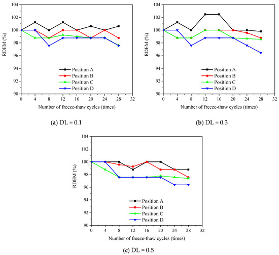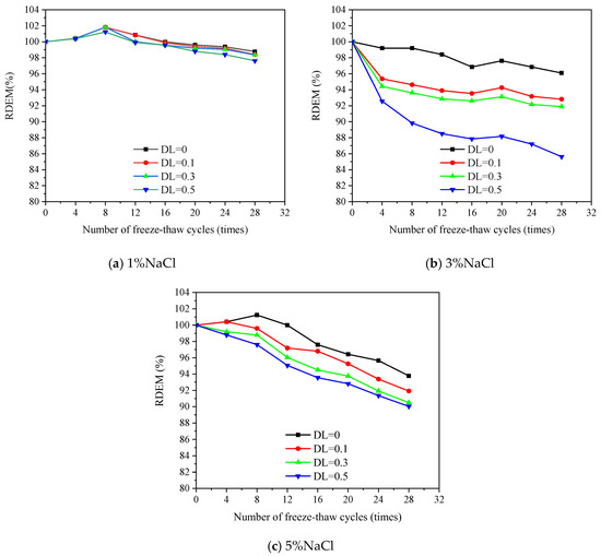 The sustained load accelerates the deterioration process as it is shown that the loss of RDEM increases with DL. In case of 3% salt concentration, when DL = 0.5, the RDEM loss reaches 14.38%, which is 10.46% higher than the 3.92% of DL = 0. Moreover, the role of the DL on the deterioration is more significant for the solution with 3% salt concentration. This can be explained to the crack of brine ice formed in the pessimum salt concentration (3%) [24]. The RDEM losses are 2.39% and 9.73% in 1% and 5% salt solutions, which are 11.99% and 4.65% smaller than that of 5% salt solution (14.38%), respectively. Although specimens in 5% salt solution absorb more fluid, the pressure and the volume of solutions are decreased with increasing concentration [50]. Therefore, the most serious deterioration is observed in 3% salt solution.