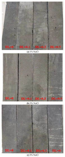 Figure 5 shows the evolution of longitudinal RDEM along the FTCs. The RDEM decreases with the accumulation of FTCs, indicating that damage or cracks are generated and accumulated inside the material due to the freezing and thawing, and similar results have been presented in [44]. In some cases, the transversal RDEM shows a slight increasing trend within the first 12 FCTs due to the recovered continuity of the materials. The hydration products produced by the ongoing hydration and pozzolanic reaction fills part of the FTCs-induced cracks or the interface between fiber and matrix [45]. However, there is no obvious spalling and damage on the surface, see Figure 6. Cracks were hardly observed in all the specimens, except for the combination with DL = 0.5. It indicates that the cracks produced by the ECC are very fine and may be healed during the freezing and sawing process under the low deflection. At high stress levels, white stuff is present on the crack surface of the specimen. It may be the formation of Ca(OH)2 and calcium carbonate [46]. Clearly, when the salt concentration is 1%, no change is found and even the specimen is under a relatively large DL. Specifically, after 28 FTCs, the RDEM only decreases 10% for DL = 0.5 in 1% salt solution. This indicates that ECC has a strong resistance to FTCs even under a relatively high stress level of sustained load. Similar results have been reported by [35]. When the salt concentration increases to 3%, a more severe loss of RDEM is observed. This is in accordance with the observation in plain concrete or mortar [47] as the glue-spall stress reaches the maximum at this pessimum salt concentration [24]. With no load, the loss of RDEM is about 5%. Nevertheless, the loss of RDEM is much lower compared with plain concrete [48] in which the loss of RDEM reaches 20% when exposed to a similar condition in just 16 cycles. This is because fibers can effectively resist the expansion pressure generated by the freezing. Meanwhile, the fiber introduces flaws into the matrix, which is beneficial for frost resistance [49].