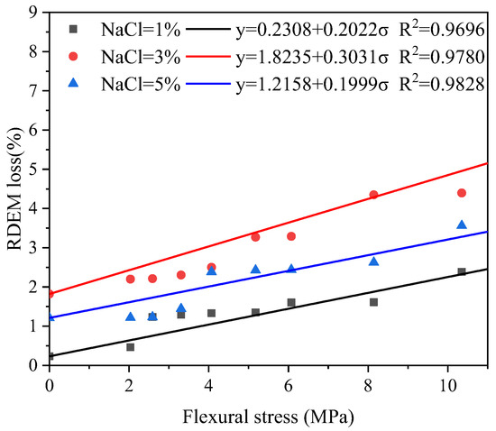The loss of transversal RDEM after 28 FTCs and the local flexural stress is plotted in Figure 10. It clearly shows that the RDEM loss and flexural stress can be expressed as a linear relationship. The following equation was, therefore, proposed: