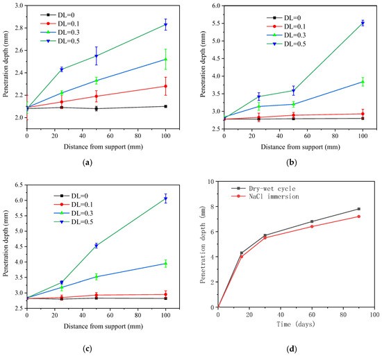 Figure 11a–c plots the measured chloride penetration depth at various positions after 28 FTCs. Regardless of the de-ice salt concertation, the further from the support, the higher penetration depth is observed. This can be attributed to the fact that the area further from the support is under greater sustained local stress level. Combined with the FTCs, more microcracks are created in the area under higher sustained stress. At the support, no significant change is found between specimens under different load levels. This indicates that the shear force at the plane has little contribution to the chloride ingress from the exposed surface. When the deflection level is 0.1 (stress level = 0.59), no significant increase is observed for all cases. This does not hold once the DL reaches 0.3. In terms of 1% NaCl solution, the penetration depth increases from 2.28 mm to 2.52 mm when the deflection level grows from 0.1 to 0.3 at the pure bending zone. The penetration depth increases to 2.83 mm when DL = 0.5.