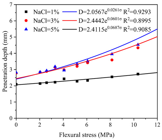 Figure 12 presents the evolution of chloride penetration depth with the flexural stress level. An exponential equation was prepared to describe the relationship between them: