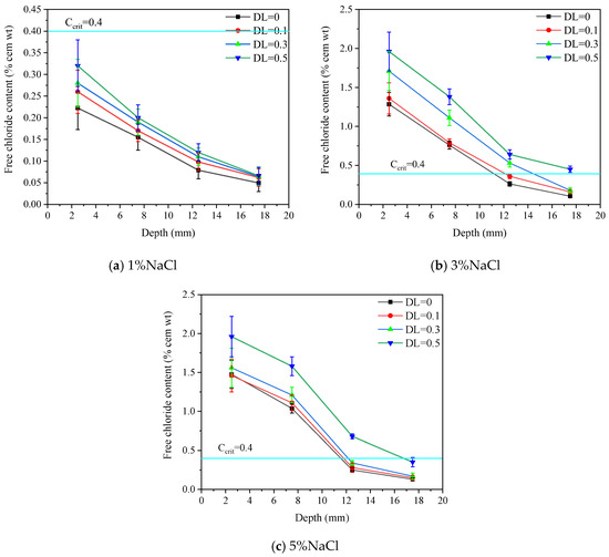Figure 13 shows the free chloride content profile in the pure bending zone. The content of free chloride decreases with the depth perpendicular to the exposed surface and the slope becomes gentler. In terms of 1% salt concentration, the free chloride content is 0.22%, 0.26%, 0.28% and 0.32% under different deflection levels at 0–5 mm depth, respectively. The increments are 18.1%, 27.3% and 45.5% for DL = 0.1, 0.3 and 0.5, respectively, compared with DL = 0.