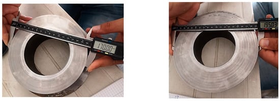 - The maximum temperature of the deposited layer, i.e., 300 °C, before the start of the welding/deposition of the consecutive layer proved to be correct because, following the controls carried out, the deformation of the substrate material was less than 0.5 mm—measured at the inner diameter of the tubular substrate blank [25].