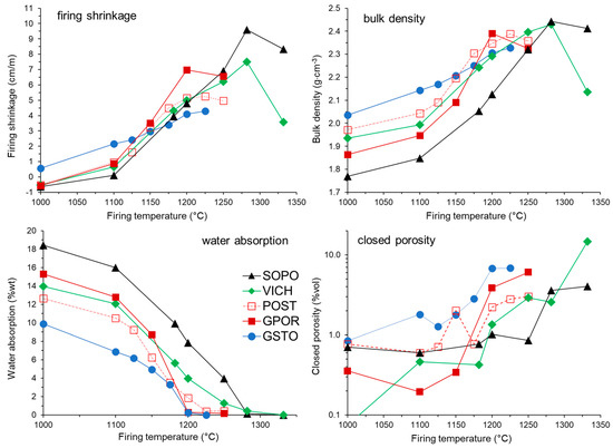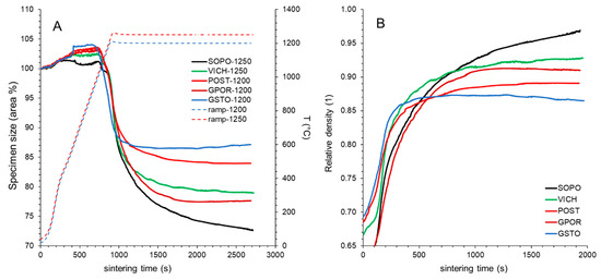 The temperature at which the densification begins and the extent of the different sintering stages influence the efficiency of densification (expressed as maximum relative density), as well as the start of de-sintering process. The main features of this process can be appraised by inspecting the isothermal curves at temperatures as close as possible to those of optimal firing for each batch (i.e., 1200 °C for POST, GPOR and GSTO; 1250 °C for SOPO and VICH) (Figure 3).