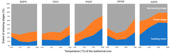 Ceramic bodies sintering mechanisms were also investigated by in-situ experiments through hot stage microscopy under isothermal conditions. The main parameters are reported in Table S2. The temperatures at which the densification starts are quite close for SOPO and VICH, with an average value of 1045 ± 10 °C, in all the isothermal runs (1000–1150–1200–1250 °C), whereas porcelain stoneware bodies show some differences. In detail, POST is characterized by temperatures similar to that of porcelain bodies (1054 ± 22 °C), while GPOR and particularly GSTO exhibit the lowest temperatures of viscous flow activation (1006 ± 22 °C and 957 ± 17 °C, respectively). With reference to the main stages of densification (i.e., early, linear, and decreasing, as highlighted in Figure S3), the behavior of the five bodies also differs in terms of the sintering stage extent (Figure 2).